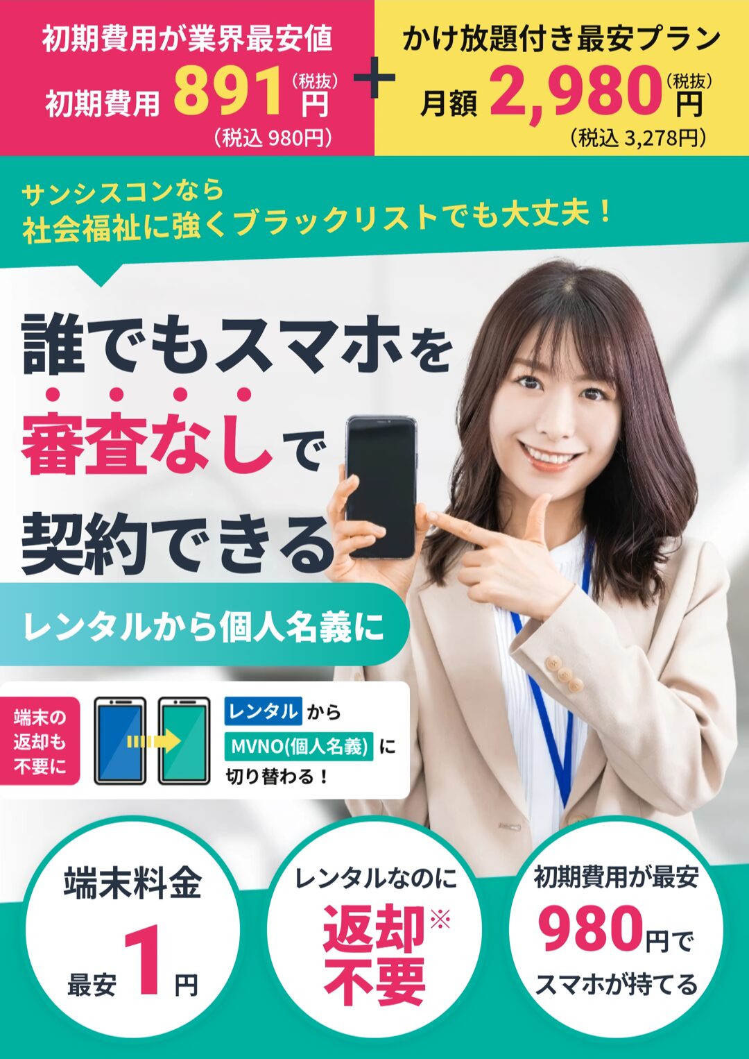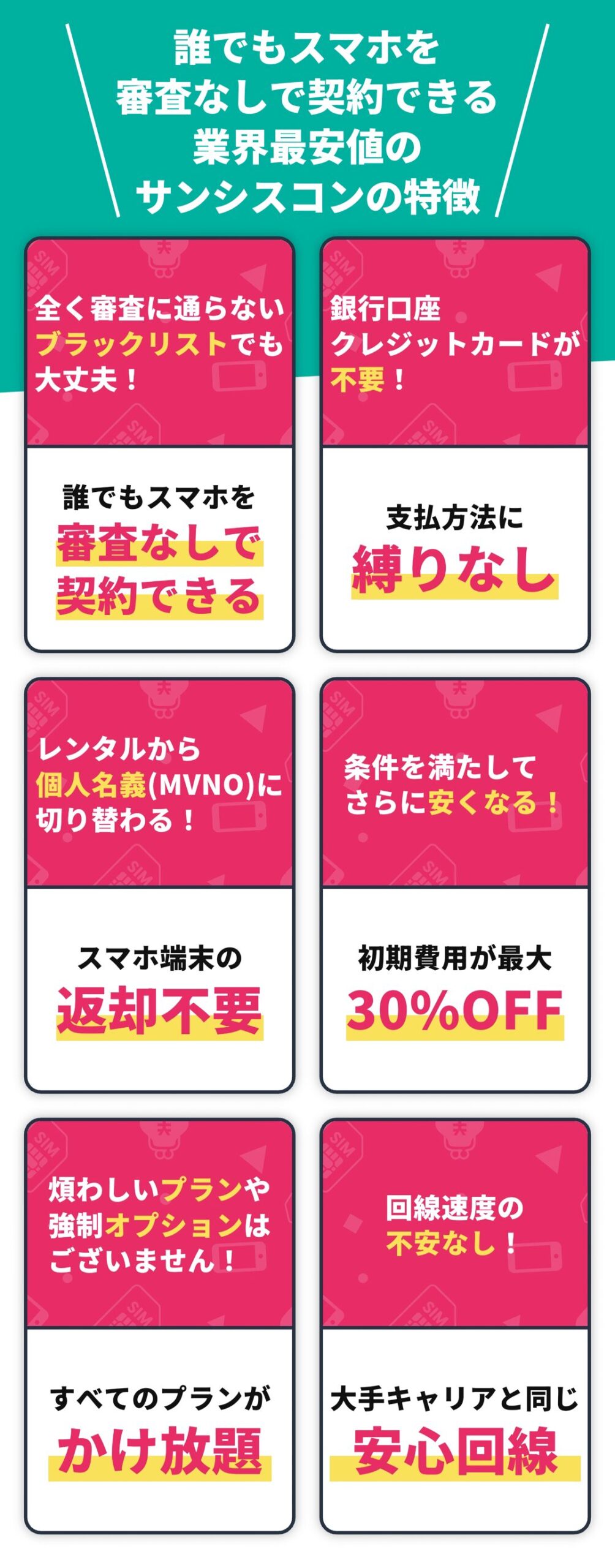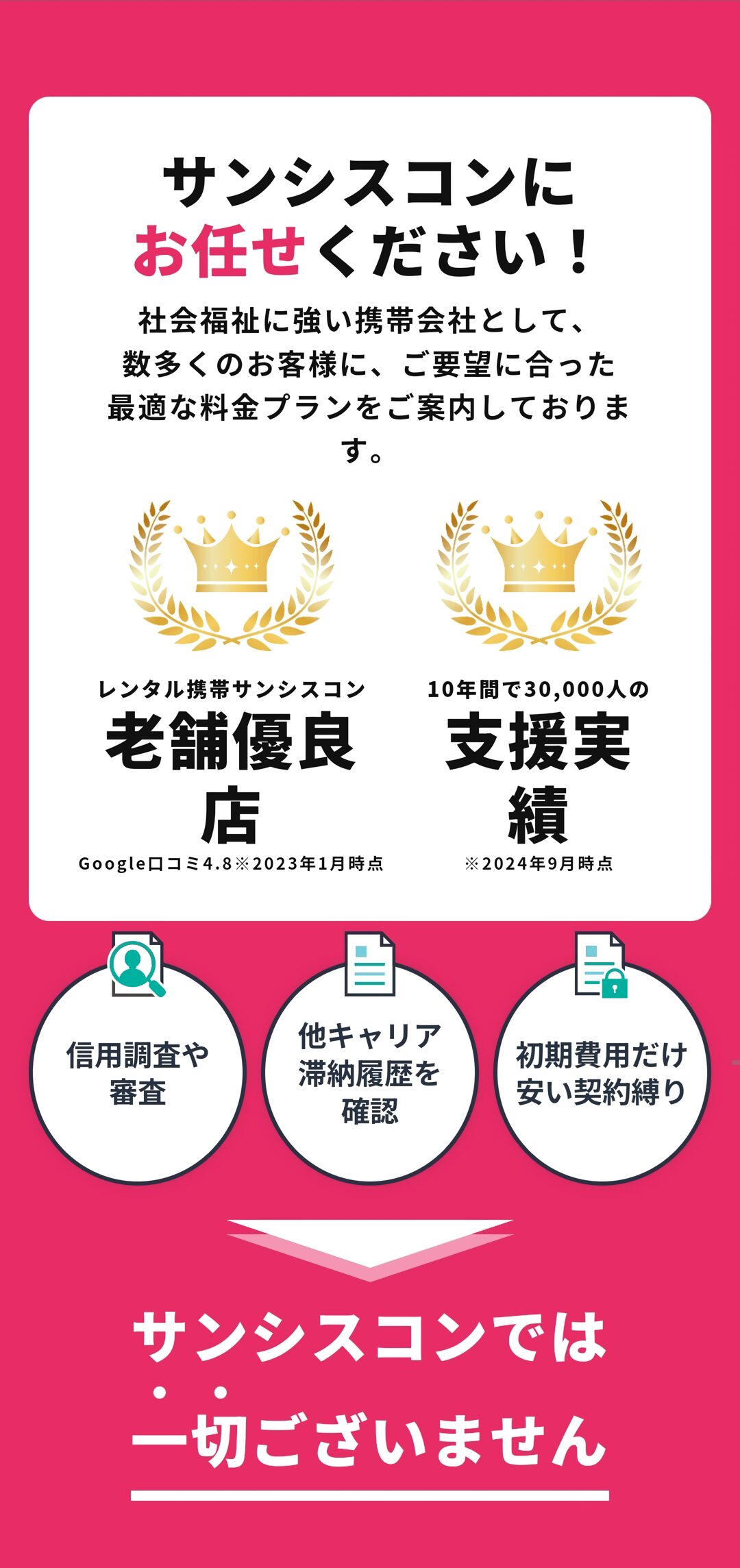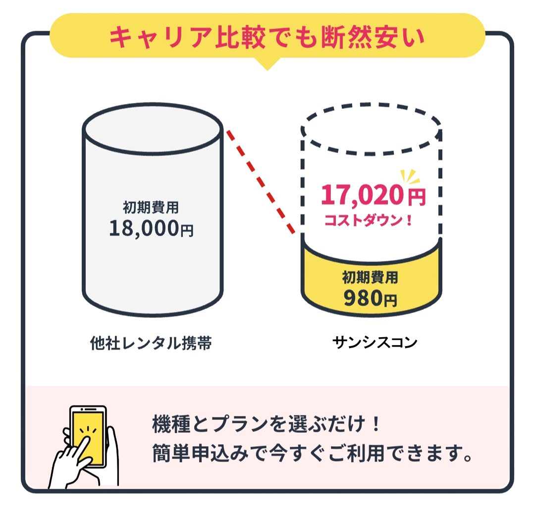 サンシスコンも①審査なし・②格安料金・③契約期間の縛りなしの条件を満たした、携帯ブラックの方に寄り添うレンタル携帯サービスです。