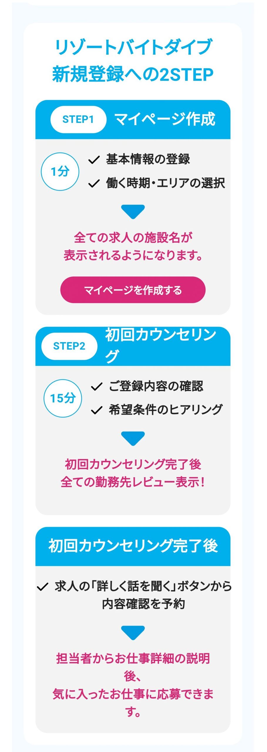 | ダイブ | 温泉地やビーチリゾート、スキー場の求人が豊富。福利厚生が充実しており、サポート体制がしっかり。 | あり | 手厚いサポート |